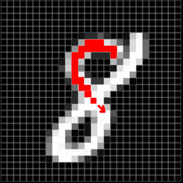 2. „Metoda szybkiego wtrysku” – wyobrażamy sobie, że musimy zamalować daną cyfrę kolorem (taka funkcja fill) wpuszczamy w jednym punkcie farbę i patrzymy gdzie może się rozprzestrzenić, ale jakby była pod ciśnieniem więc np. w cyfrze 8 na skrzyżowaniu nie rozlewa się na wszystkie strony tylko przelatuje na przeciwną stronę „skrzyżowania” i leci dalej.